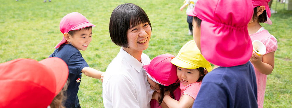 じつは、私は人見知りなんです。1年目は、いろんな先生がいるので緊張しましたが、まわりからたくさん話しかけてくださり、自然と打ち解けることができました。今では休憩時間などに事務所へ戻ると「聞いてくださいよー!」と子どもたちの可愛かったこと、おもしろかったことなどを話しています。仕事の面でも、主任や先輩の先生たちは、いつも私の考えを尊重して「やってみたらいいよ!」と背中を押してくれます。私自身も後輩から相談された時には、自分の経験を振り返りながら、良いところは率直に“いいね”と伝え、悩んでいる時には“一緒に考える”ことを大切にしています。